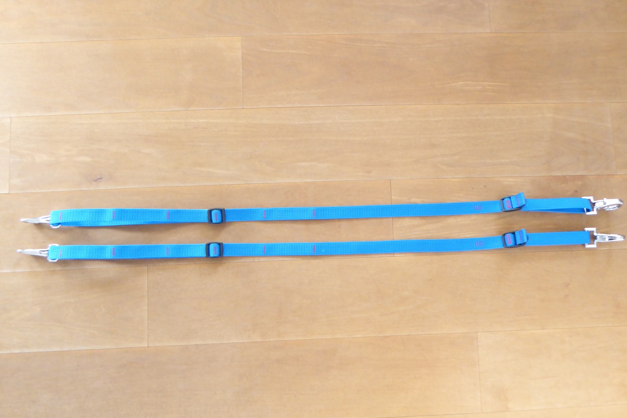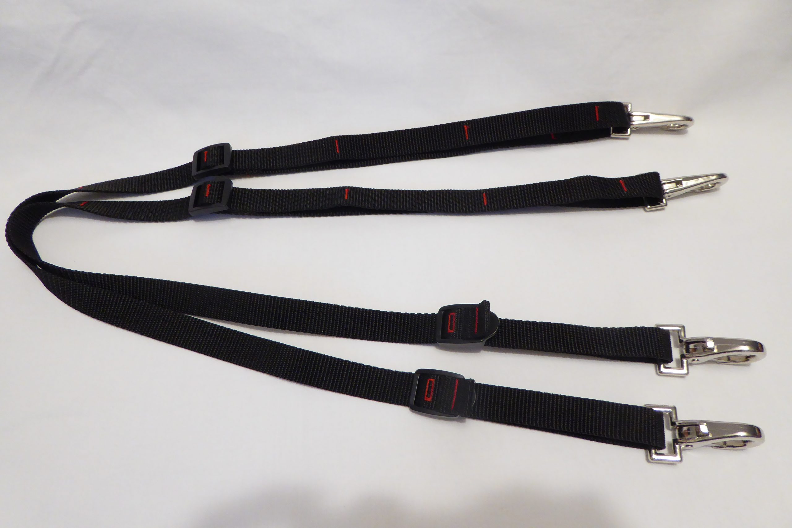 Die Ausbindezügel sind zwei Riemen aus hochwertigem Gurtband mit Schiebe- und Klemmschnallen und Karabinerhaken auf beiden Seiten (auf Wunsch auf der Trensenringseite aus Kunststoff).